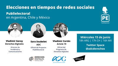 El evento, que se transmitirá por el Twitter Space de la ADC, contará con la participación de Vladimir Garay (director de Incidencia y Comunicaciones, Derechos Digitales), Sara Soubelet (oficial del proyecto PubliElectoral, ADC) y Vladimir Cortés (oficial del programa de Derechos Digitales, Article 19).
